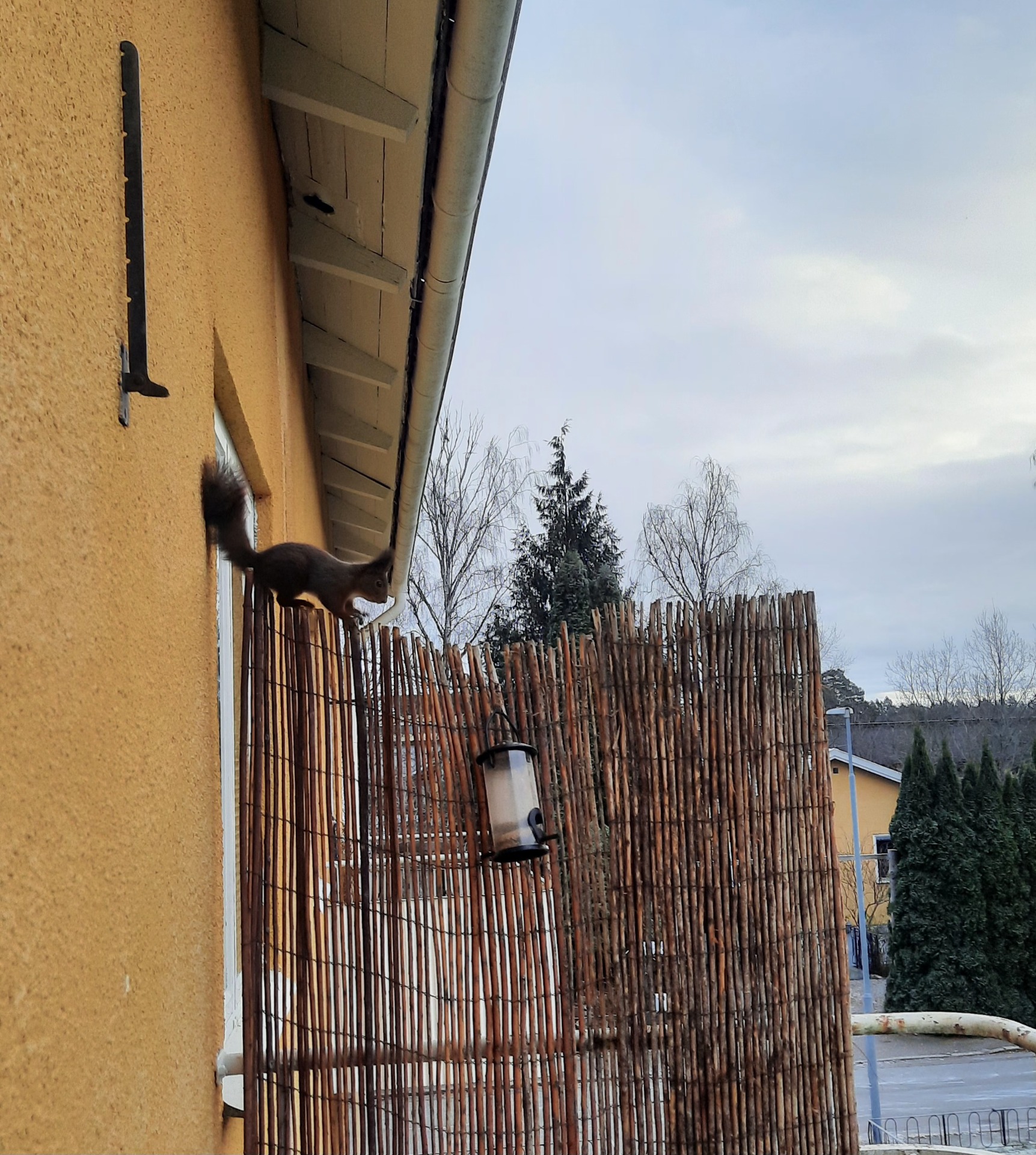 Skator, koltrast, sparvar mm. Jag har även spännande besök av en ekorre.