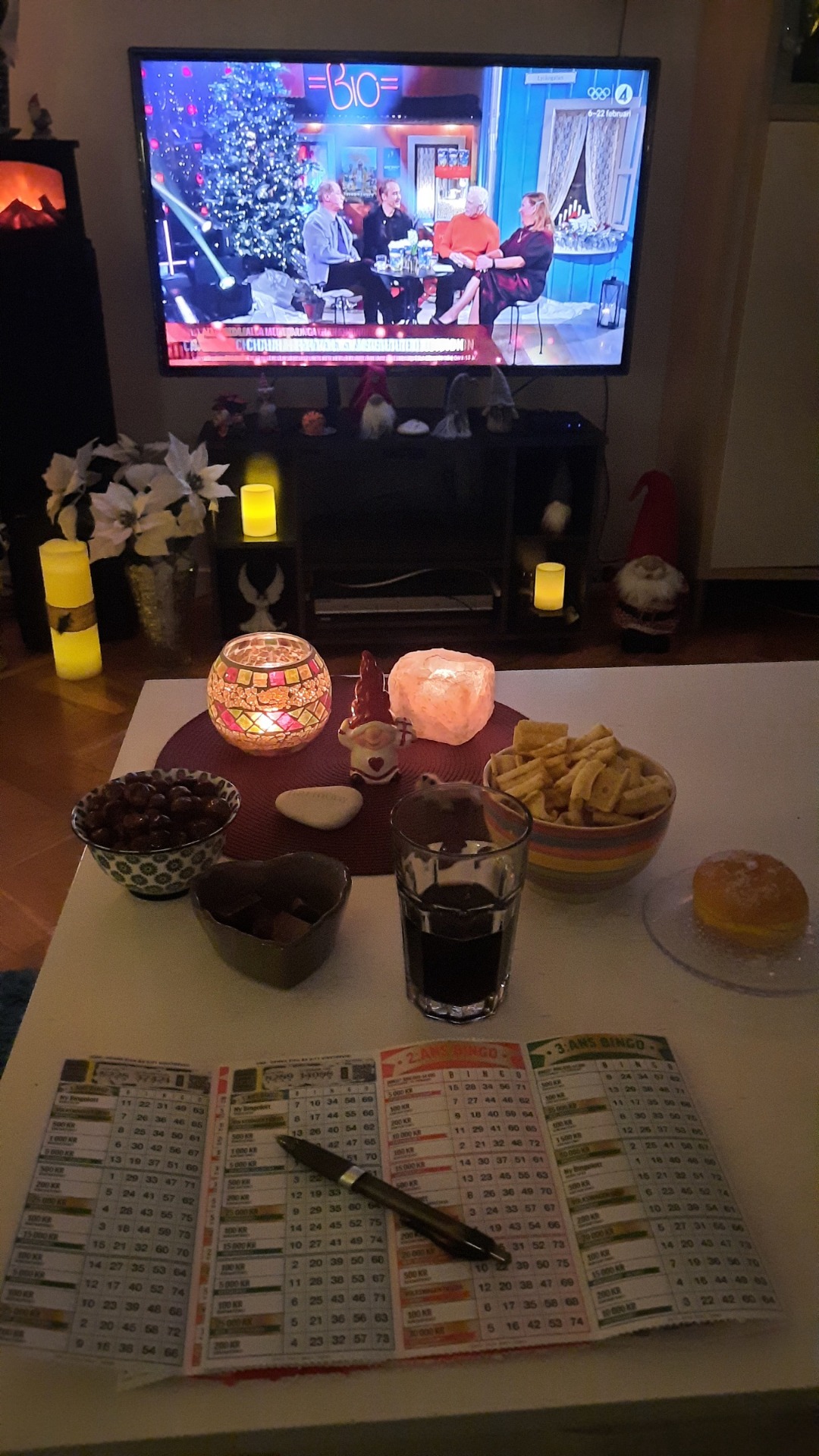 Jag valde att själv ta del av denna härliga kväll med uppesittar Bingo. Jag införskaffade såklart lotter och såg även till att jag hade lite gott att äta och dricka under kvällen. Det blev julmust, lite chips , choklad och fikabröd. Det är ju måååånga timmar framför tv:n så det går åt lite smått och gott att äta av.